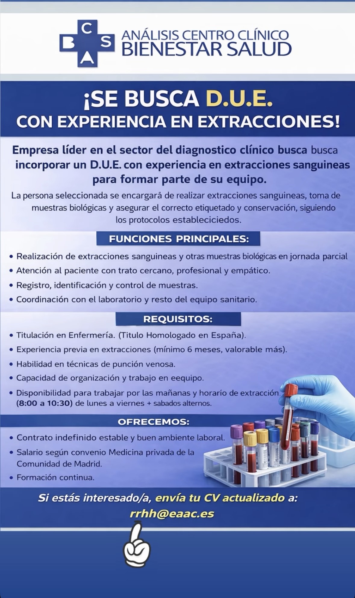 09 Feb Oferta de Empleo Enfermera Posted at 09:25h in Ofertas de Empleo by Rosa María Zaballos Oferta de Empleo Enfermera ExtraccionesPara ver la Oferta de Empleo pincha, AQUÍ.